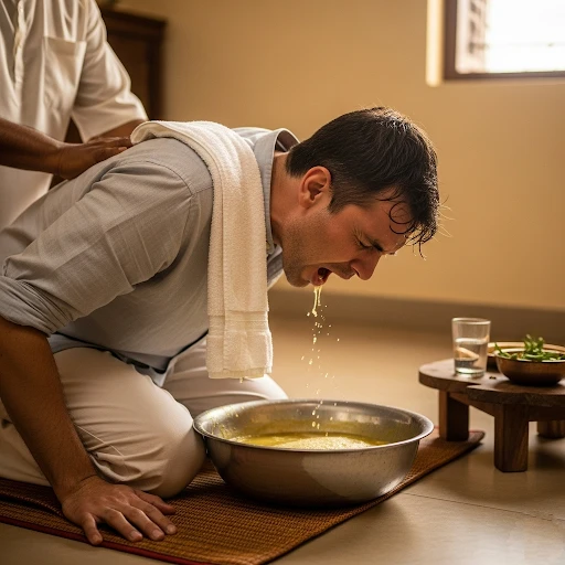 Therapeutic vomiting removes the aggravated Kapha from its primary seat, providing long-lasting relief.